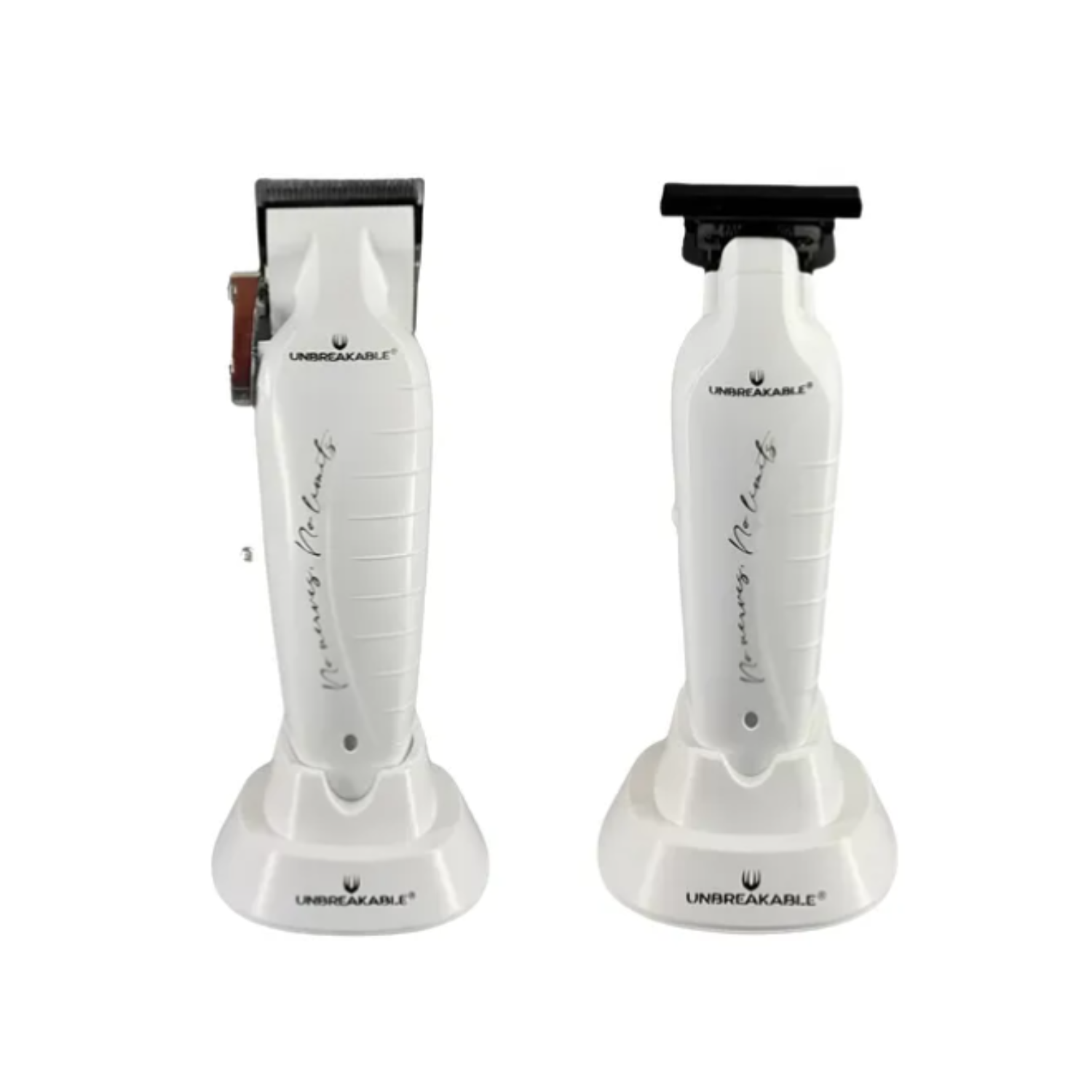 Descubre el Combo Clipper + Trimmer Profesional Unbreakable en color blanco, diseñado para quienes buscan precisión y comodidad en el corte de cabello. Con su potente funcionamiento inalámbrico y batería recargable, te ofrece libertad de movimiento, permitiendo un corte eficiente en cualquier lugar y momento, ideal para viajes y uso familiar.