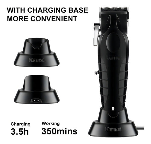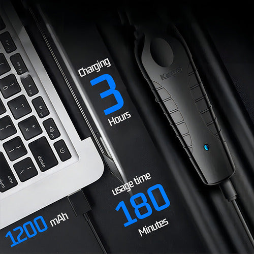 La Máquina Kemei 2296 funciona con una potente batería de iones de litio, que ofrece un tiempo de funcionamiento de 350 minutos después de 3.5 horas de carga completa. Viene con un cable USB universal, base de carga y enchufe de carga.